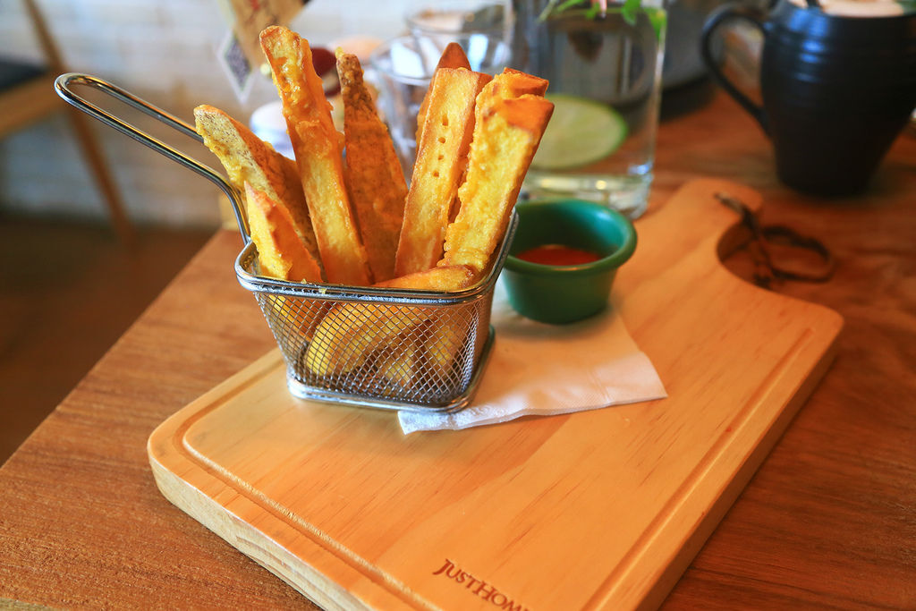 等了一段時間,剛炸好熱騰騰的地瓜薯條上桌(單點$80)。