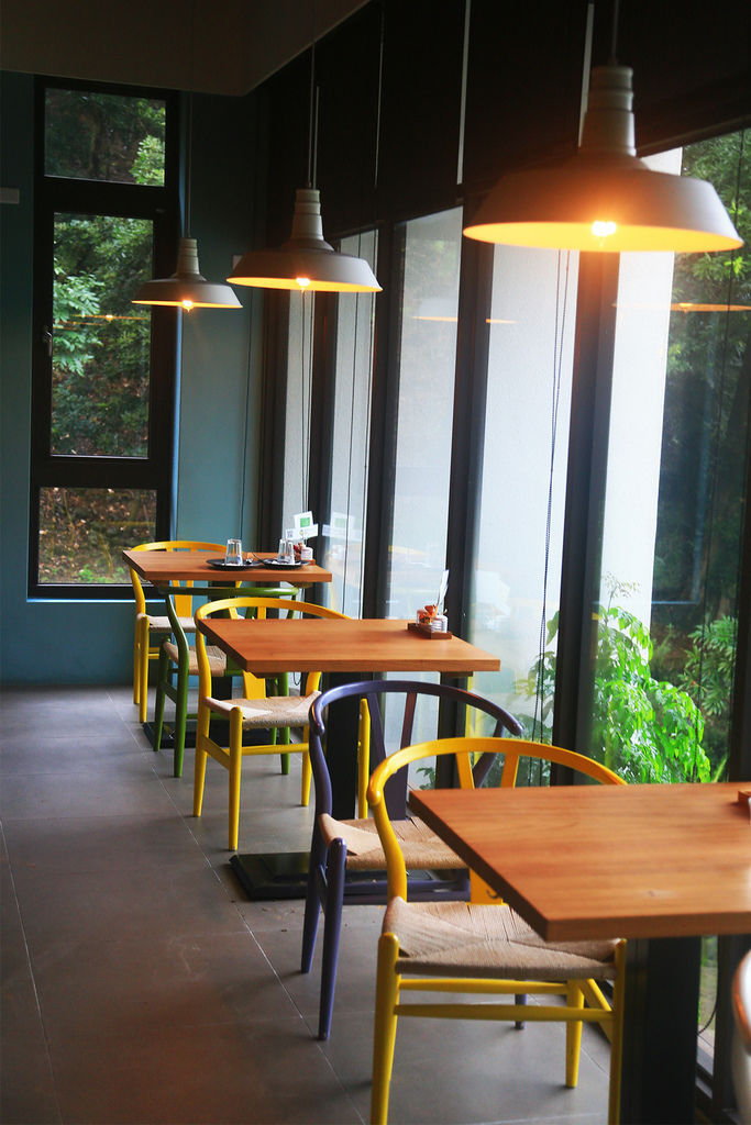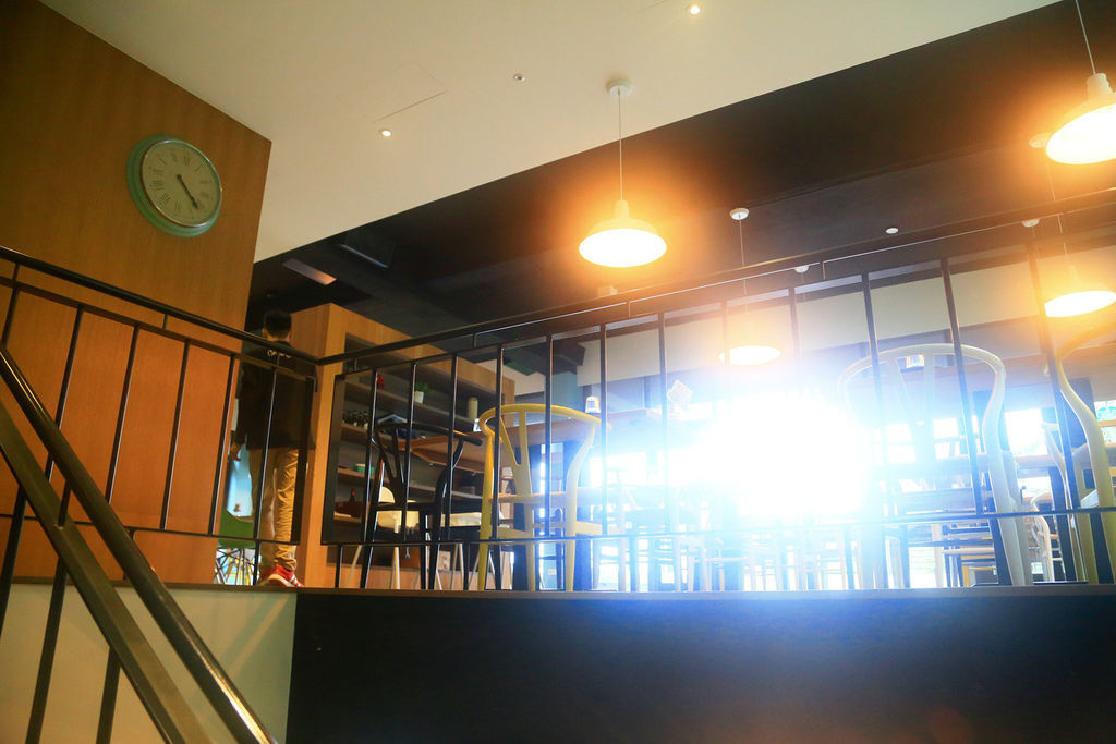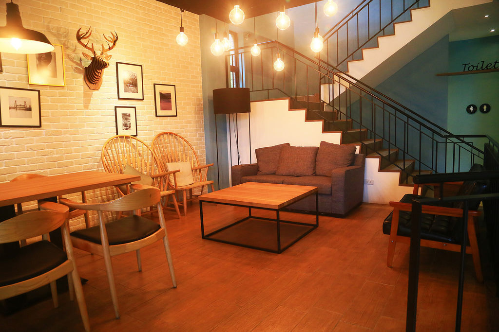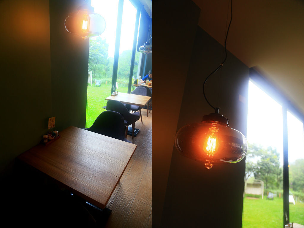 窗邊的雙人座,燈具有點似曾相識但不記得在哪看過,超愛這種工業風。