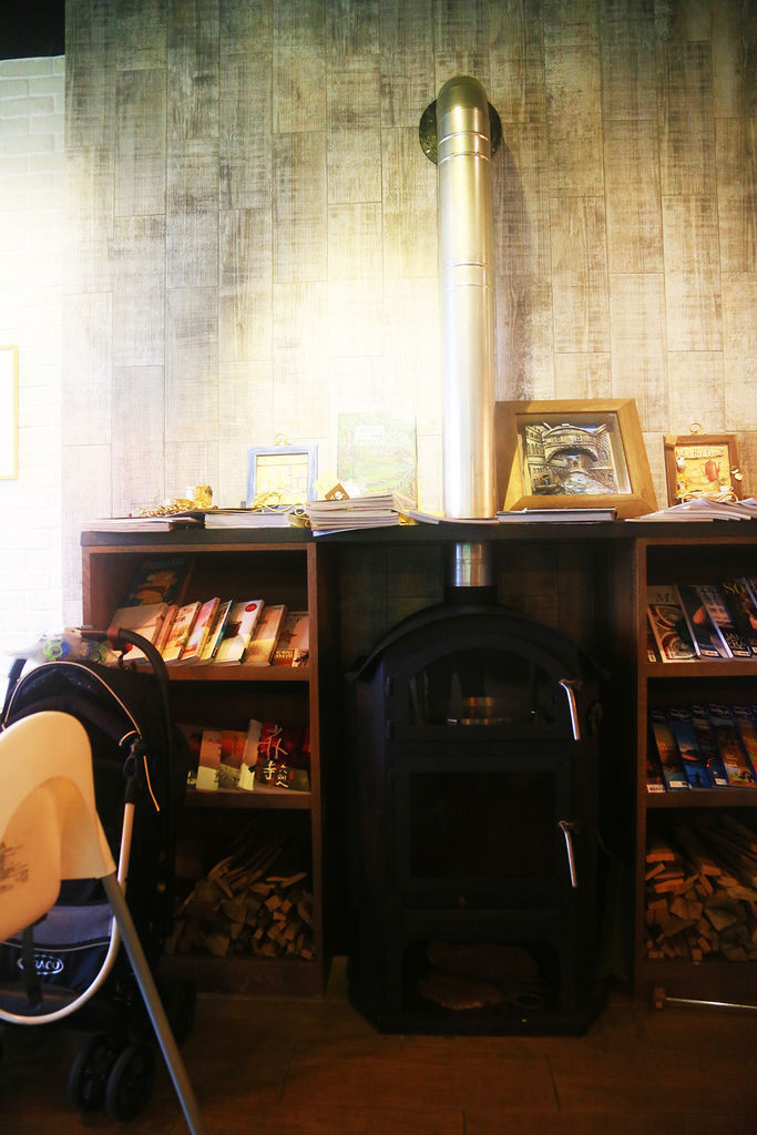 書報雜誌櫃中間夾了一個暖爐,還有旁邊的木柴,這一小塊的莊園風較濃厚。