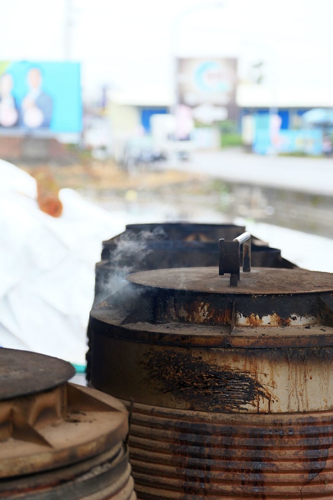 甕缸雞旁放著甕烤時滴下的新鮮雞油、酸酸的洋蔥以及胡椒粉,看個人喜好搭配。