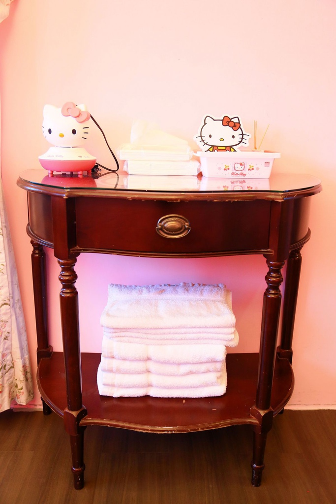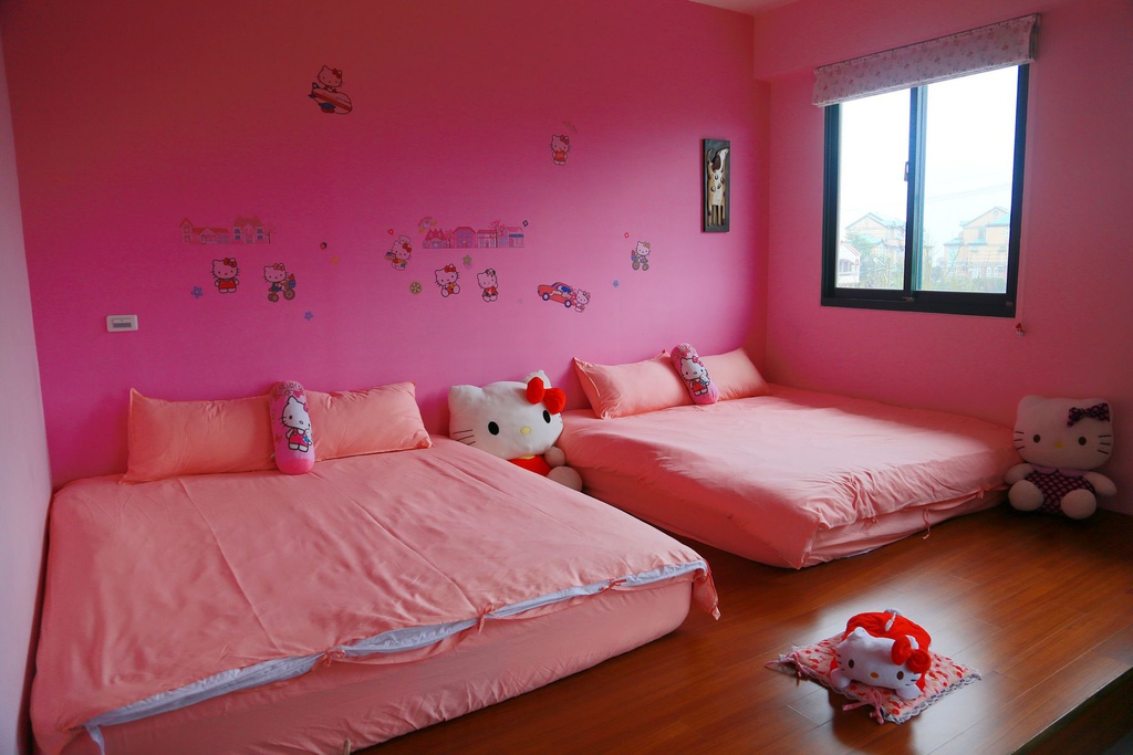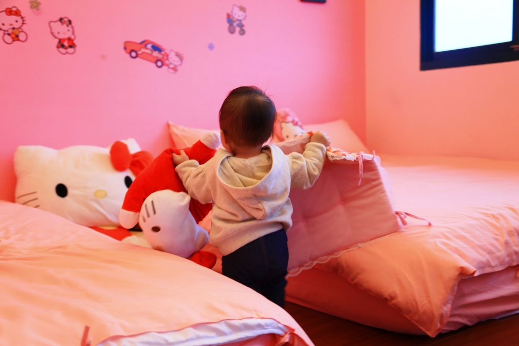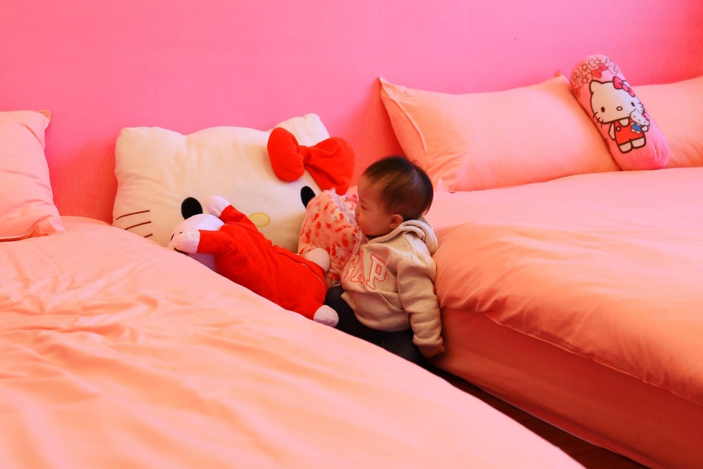 因為小田心年紀較小且睡相很差,跟朋友協商後得以分配到這間Hello Kitty主題房。