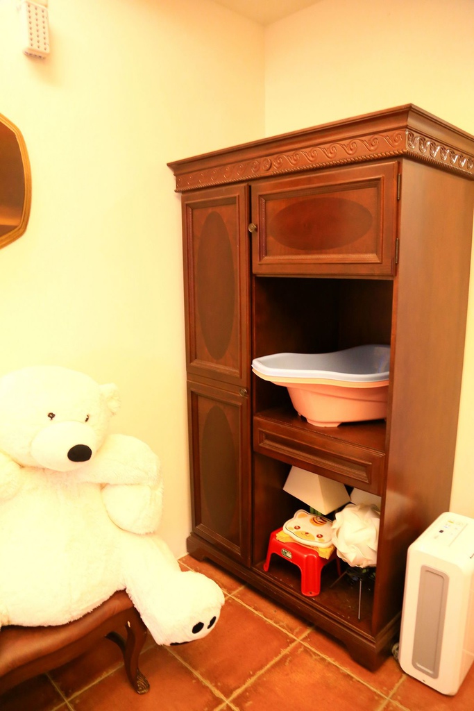 熊偶旁邊的櫃子裡附有嬰兒澡盆、兒童椅以及除濕機等用品。