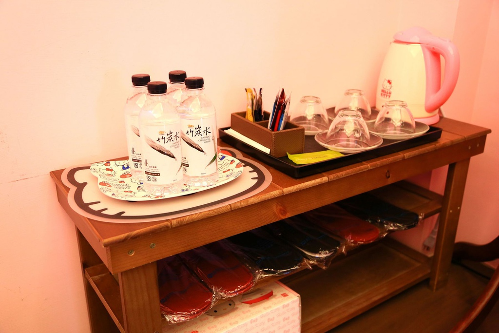 角落的矮凳上則有室內紙拖鞋、瓶裝水咖啡/茶包、杯子以及快煮壺等。