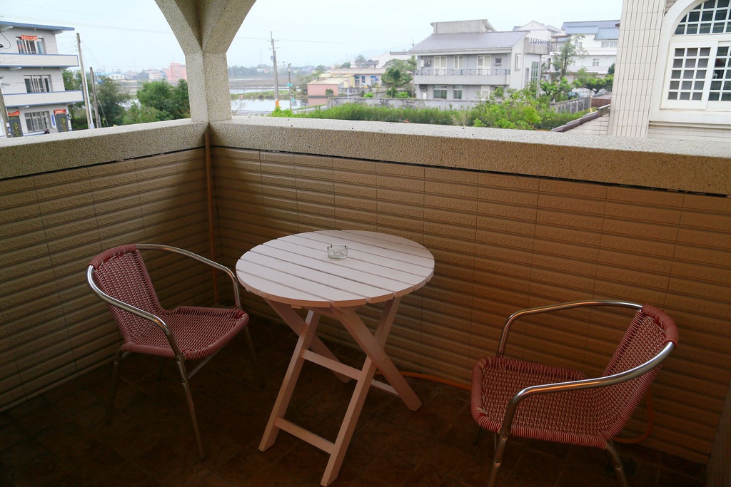 打開落地窗有個小陽台,就連桌椅都是粉色的= =