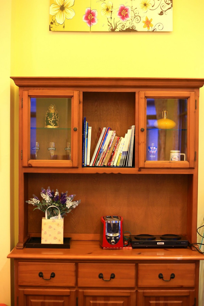 餐桌旁的木櫃上有烤土司機還有DJ混音器(?),在右邊的玻璃櫃上還有喇叭可以讓房客接手機的歌來播放。
