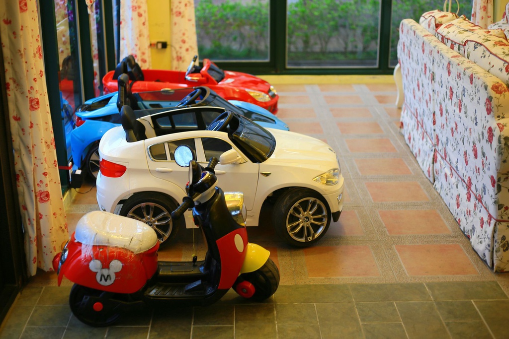 沙發後面就是讓大小孩瘋狂的電動車們,不過最前面這台米奇機車壞掉了。