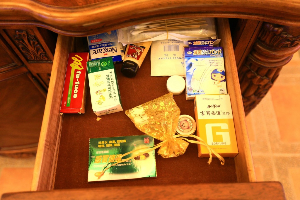 磚牆下的木櫃裡有應急藥物,算是蠻貼心的。