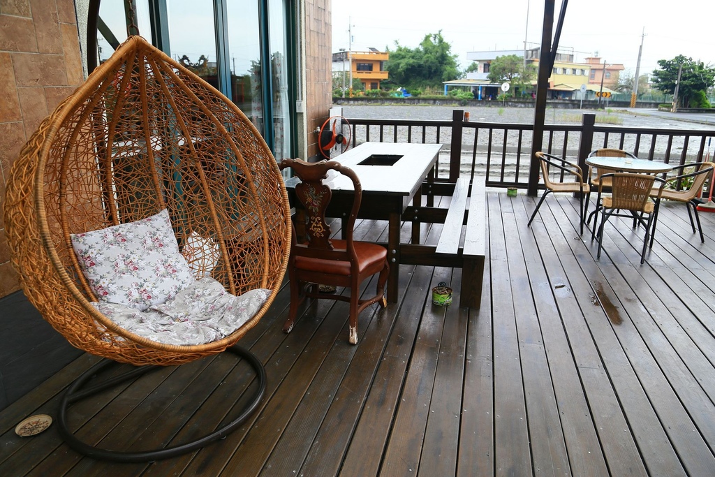 介紹完戶外空間和設施後,門前的頂棚下有規劃休憩空間,吊椅後的長桌中間應該就是烤肉台,這樣不用彎腰烤肉輕鬆許多。