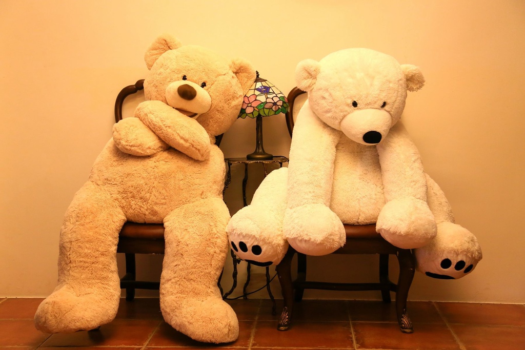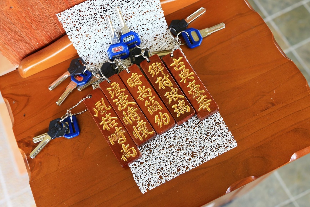 在迎賓熊的下方,整齊排列著五間房間的鑰匙,各個房間的佈置和主題也都不同。