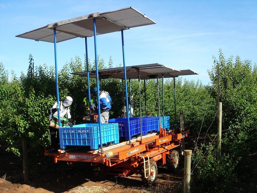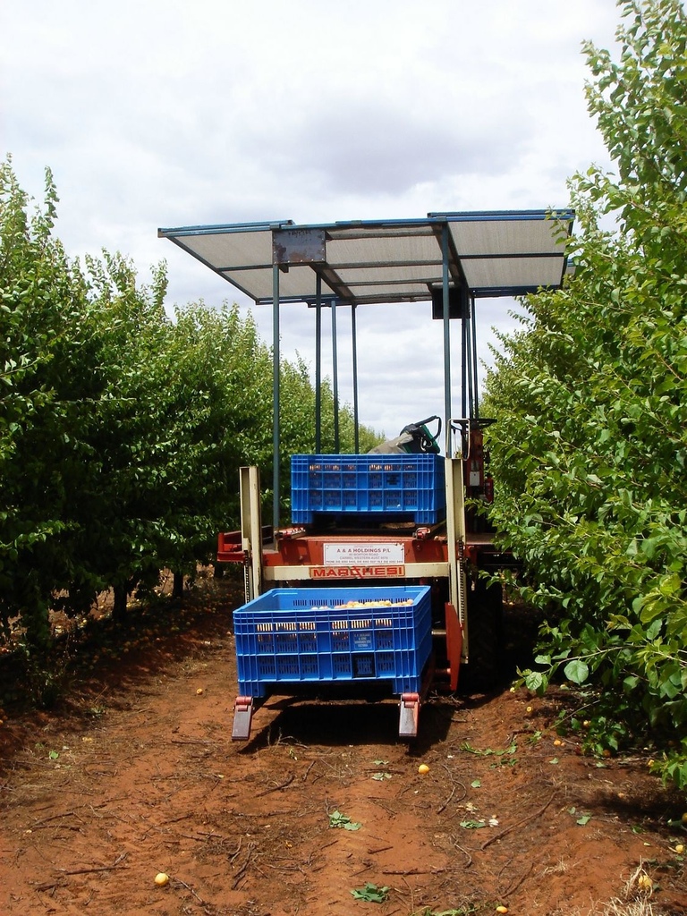 採桃的配備,雖然上面有頂蓬但遮陽效果不佳所以要戴帽