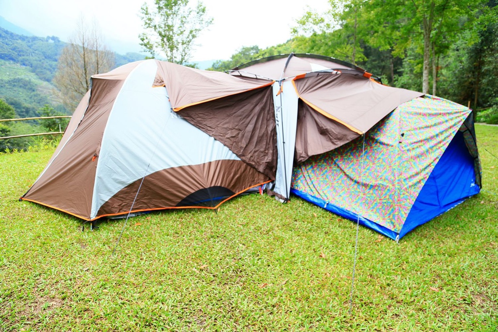 終於,趕在雨落下前把兩個睡帳、一個客聽帳順利搭好並用連接布連結
