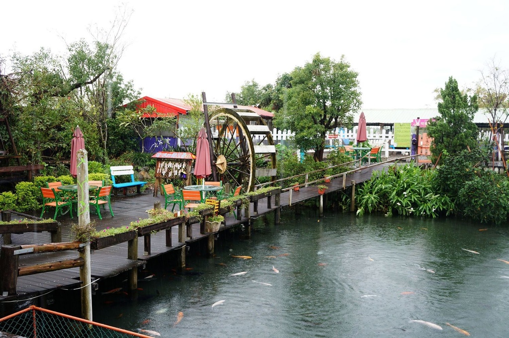 向左看是往生態區的湖上小徑,湖裡養了很多肥美的錦鯉和鴨子