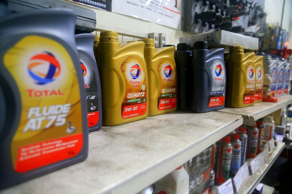 ↑架上擺放著整齊劃一的TOTAL道達爾潤滑油產品。