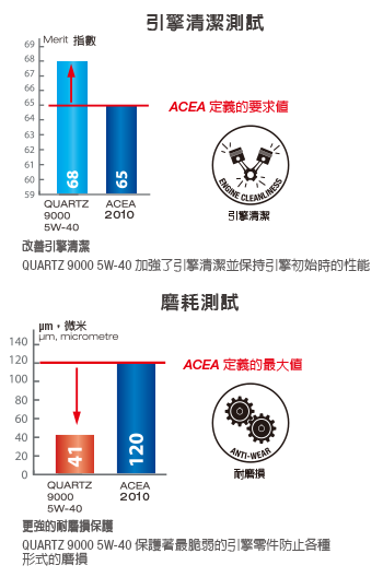 可以發現TOTAL QUARTZ 9000 5W-40的磨耗測試約為ACEA定義值的將近三倍,以往使用原廠機油時通常在4XXX即會感受到很明顯的衰退感